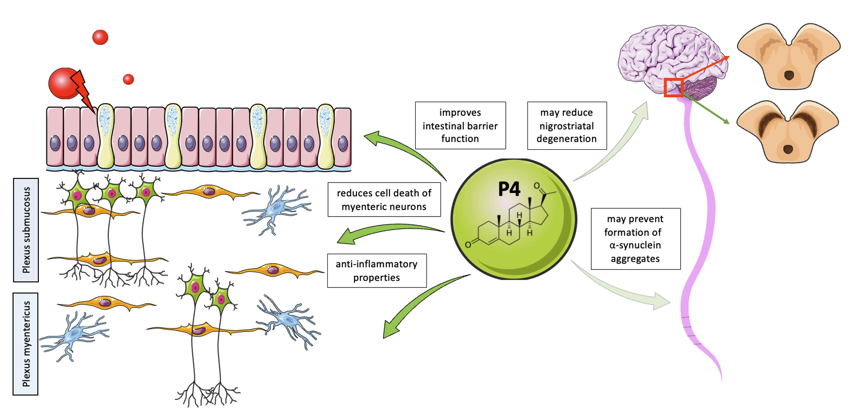 Ein Steroidhormon, das hierbei besondere Aufmerksamkeit erregt, ist Progesteron (P4), welches nicht nur eine Schlüsselrolle im weiblichen Reproduktionssystem spielt, sondern auch neuroprotektive Eigenschaften aufweist. Studien der Abteilung für Cytologie und anderer Arbeitsgruppen haben gezeigt, dass P4 neuroprotektive Mechanismen innerhalb der Darm-Hirn-Achse hat. P4 scheint dabei Einfluss auf die Darmpermeabilität zu nehmen, was die Barrierefunktion des Darms stärkt und somit das Eindringen von schädlichen Substanzen in den Blutkreislauf reduziert. Diese Barriere spielt eine entscheidende Rolle, da eine gestörte Darmbarriere mit neurologischen Störungen in Verbindung gebracht wird. Außerdem können durch P4 Entzündungsreaktionen im Darm und im Gehirn moduliert werden. Solche Entzündungsreaktionen gelten mit als Hauptfaktor bei der Entstehung neurodegenerativer Erkrankungen.